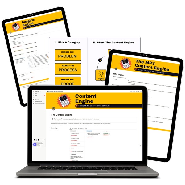 The MP3 Content Engine is built around the concept of turning ideas collected from the target audience to tangible content, and creating effective content assets. Erica Schneider knows that having insights is only half of what it is. This system includes actionable insights, and frameworks which will transform those ideas into completed pieces of content. The MP3 Content Engine has produced such results as a person generating 43 ideas within days, and a different person cutting their content production time down to just half an hour. The people utilizing the Engine do not just come up with ideas, but effectively implement those ideals into their business.